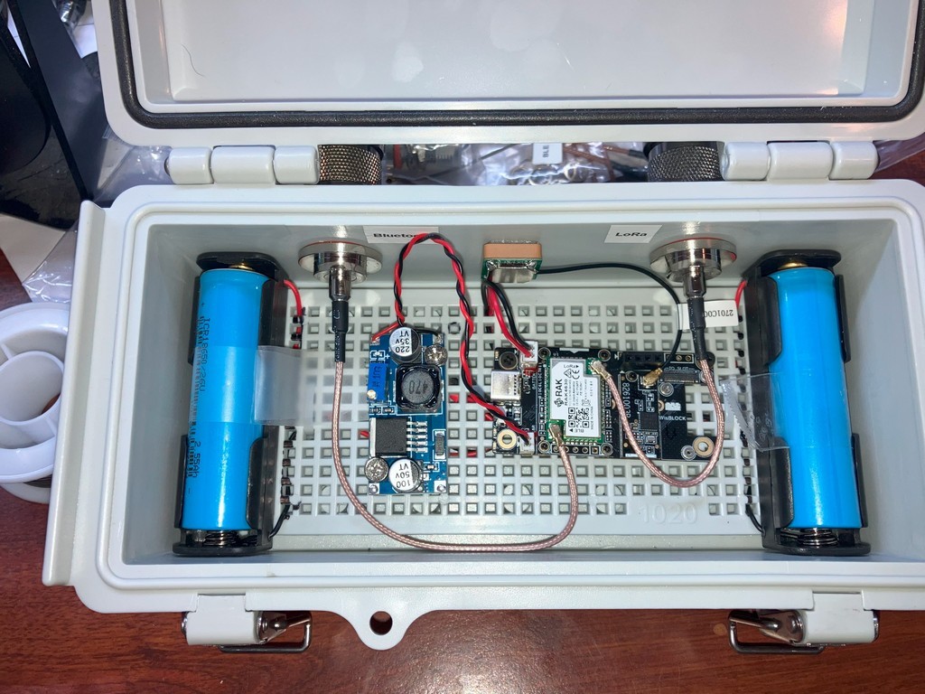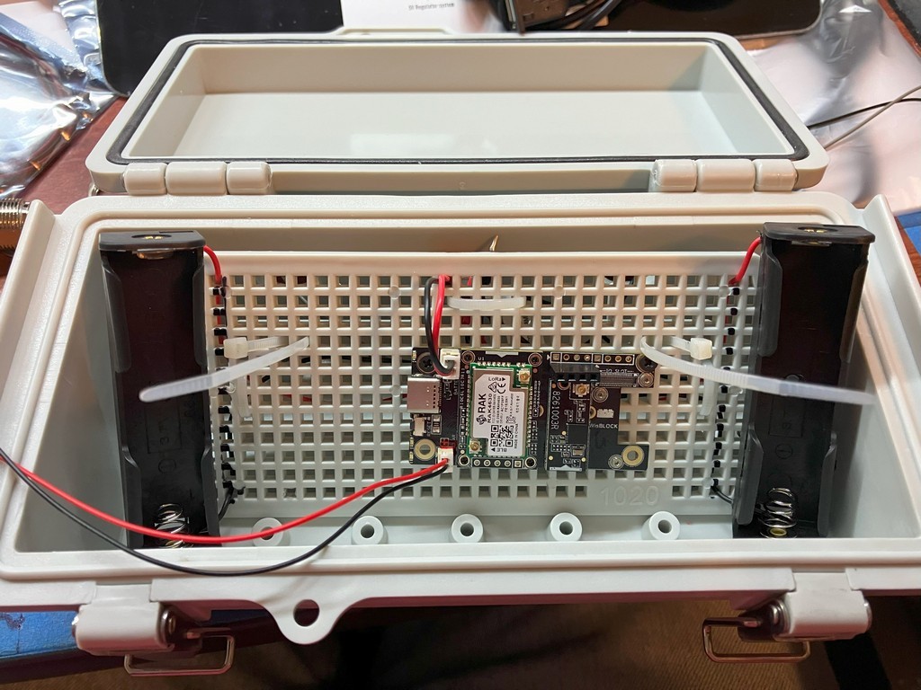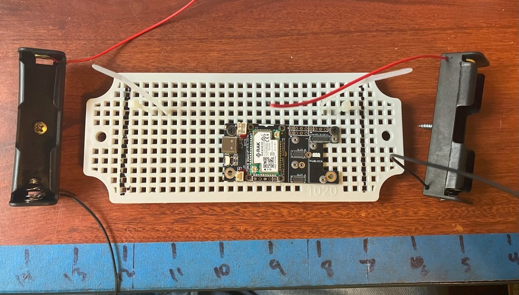 Since most LoRa devices don’t use much power, it is easy to power them using a small battery and solar panel. My first LoRa/Meshtastic device build used an exterior grade, IP67-rated case, with a 12V solar panel to recharge two 18650 batteries. Because the solar panel I already had on hand was a 12V 20W solar panel, and the WisBlock accepts a maximum of 5V to its charging circuit, I also had to purchase a buck converter, which is a device that converts one DC voltage (up or down) to another DC voltage. It would be better to simply start with a 5v panel that produces around 5 watts, which is more than enough for the WisBlock LoRa device. I still recommend using a voltage regulator on any solar charging circuit to ensure it does not go above 5V to the WisBlock device. On my unit, when using the GPS module, it was draining faster than it was recharging, at least while the solar panel was just laying flat against the inside of my window for testing. Outside, with a better line of sight to the sun and a corrected mounting angle, it probably would have been fine, even with the GPS enabled.